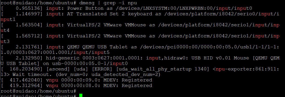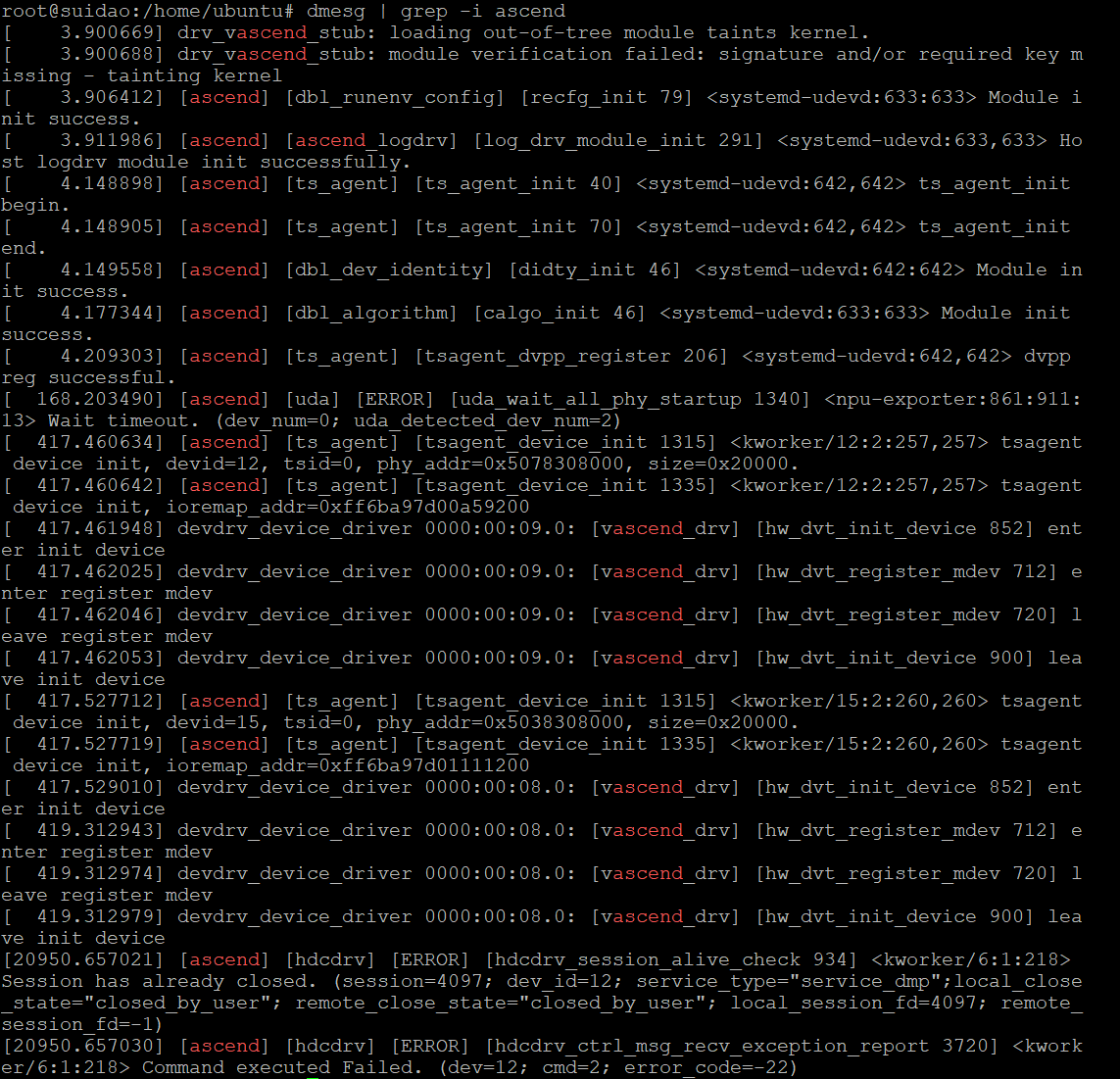 [ 168.203490] [ascend] [uda] [ERROR] [uda_wait_all_phy_startup 1340] <npu-exporter:861:911:13> Wait timeout. (dev_num=0; uda_detected_dev_num=2)