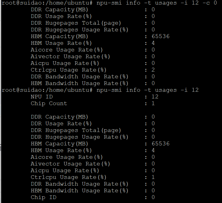 npu-smi info -t usages -i 12 # 查看 NPU 0 的使用情况
