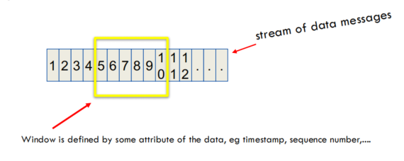 而我们用一个高亮的矩形框(window)圈住其中的一部分元素,比如最近的 N 个,或最近的几秒钟的数据。