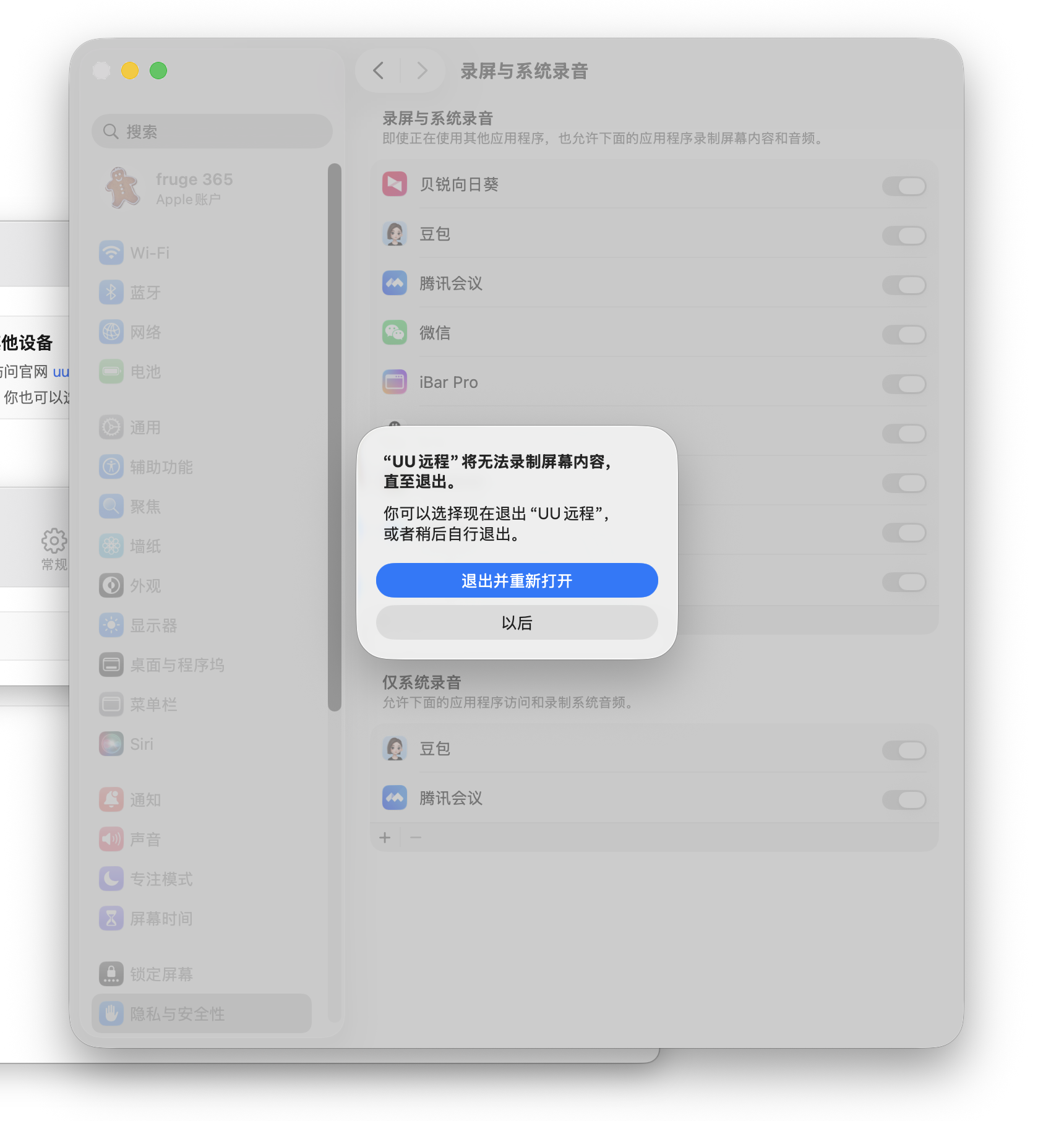黑屏问题:重启网易 UU 远程内测版本客户端,重新检查 "录屏与系统录音" 权限是否开启,内测时发现部分用户是因为权限开启后未重启,或被控端系统版本低于 13.0;