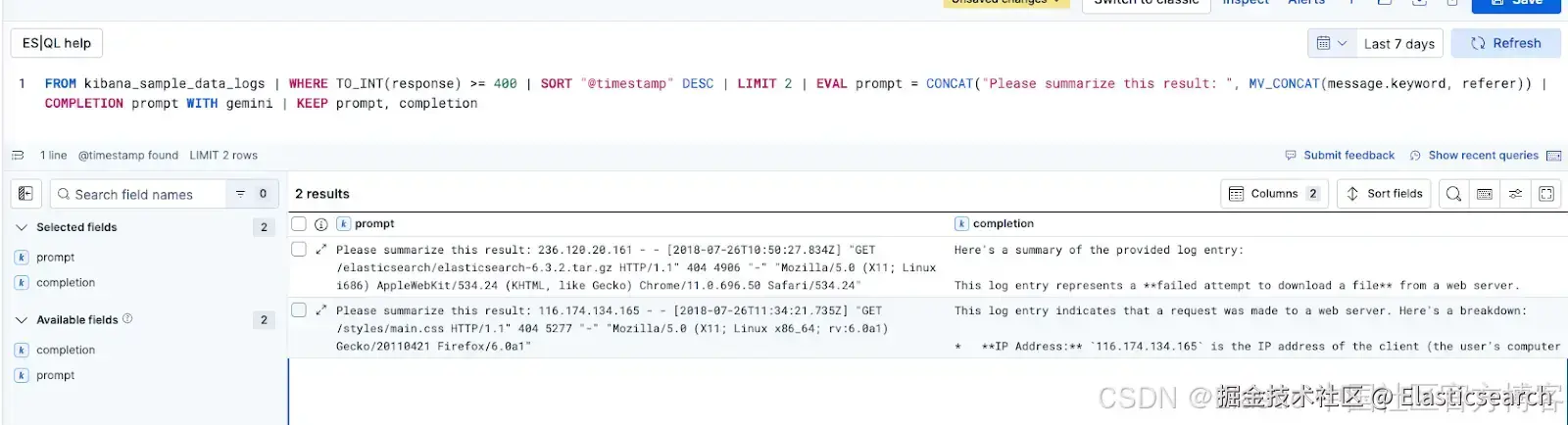 KEEP prompt, completion ------ 这指示 ES|QL 生成一个表格,包含我们发送给 Gemini 的 prompt 以及收到的结果