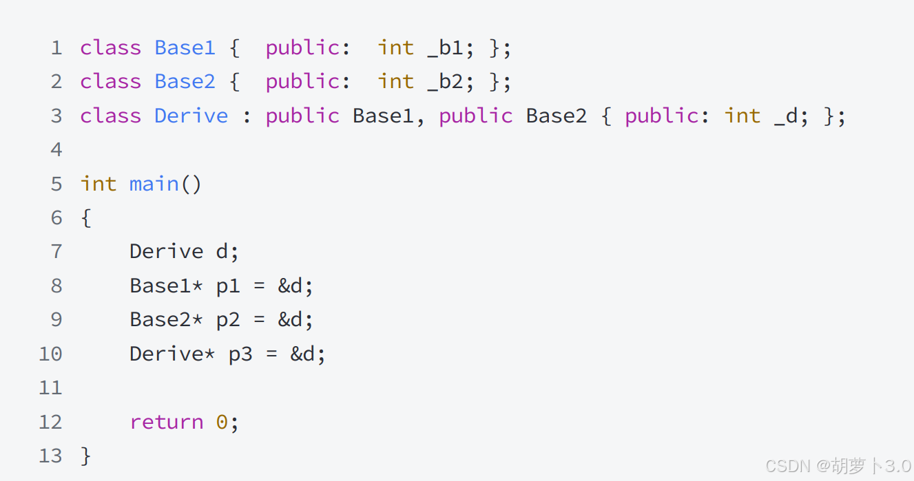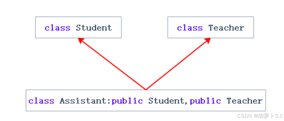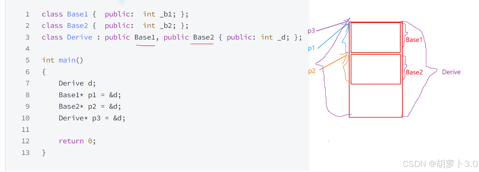 而多继承是指:一个派生类有两个或者两个以上直接基类时称这个继承关系为多继承,多继承对象在内存中的模型是,先继承的基类在前面,后面继承的基类在后面,派生类成员放在最后面。