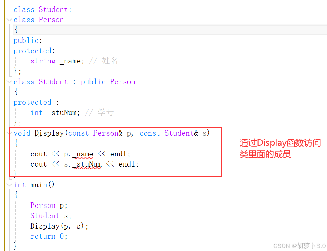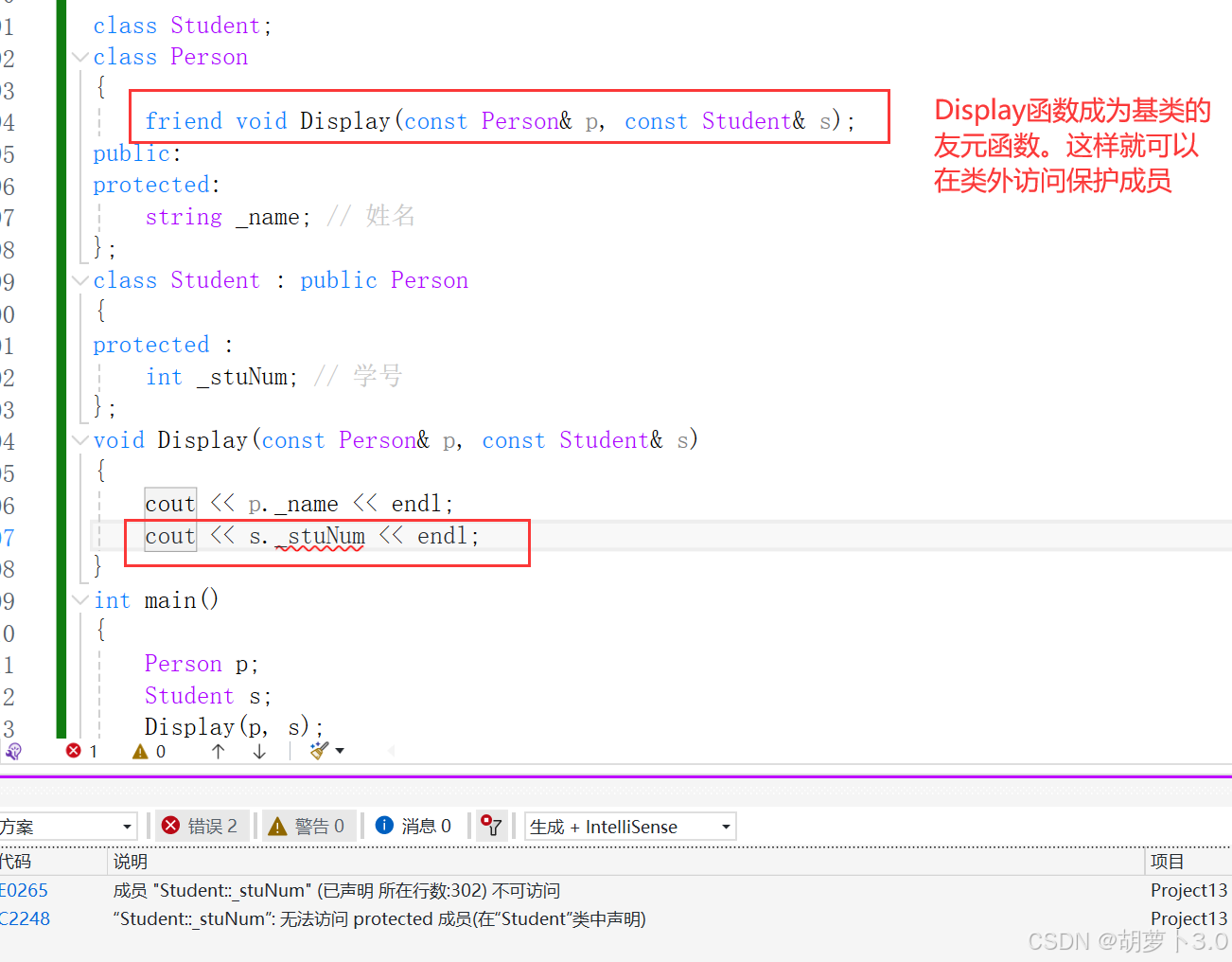 但是我们知道类里面的私有成员或者保护成员在类外无法访问,此时我们就可以将Display函数成为基类的友元函数------