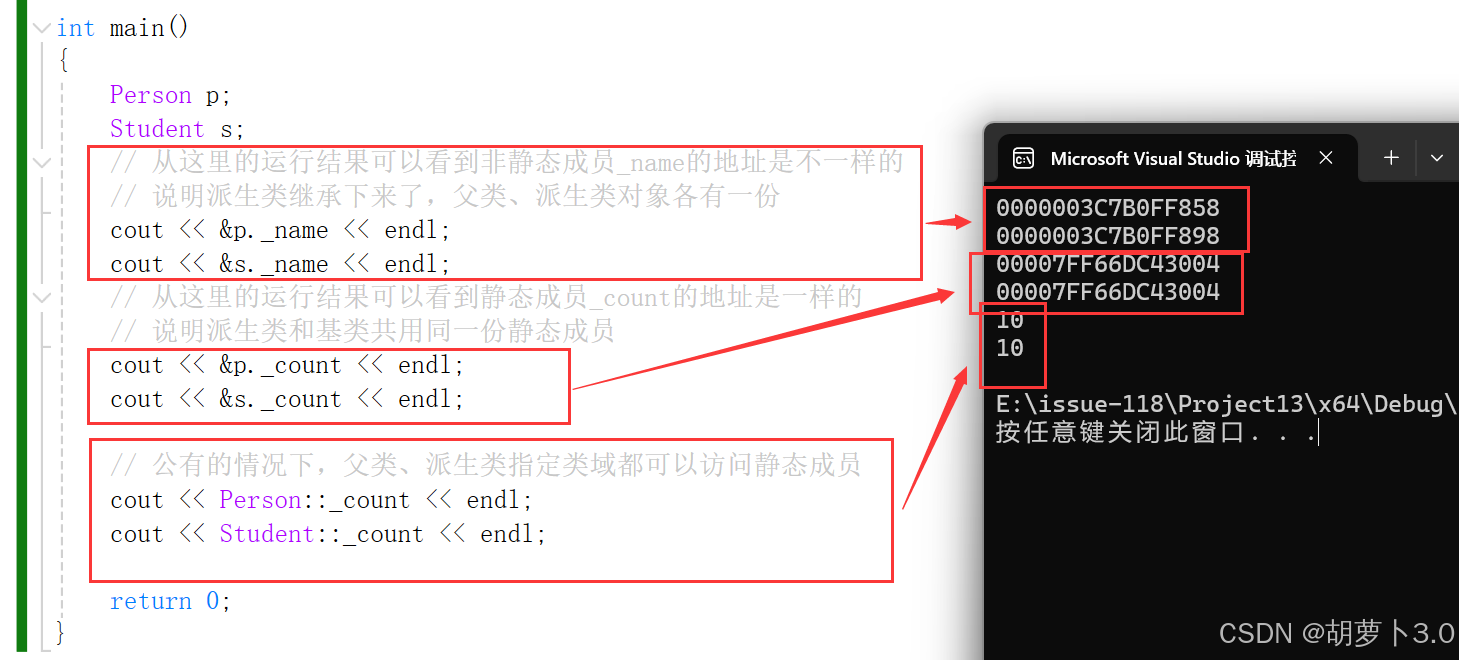 通过前面的学习,我们知道派生类继承基类中的成员,派生类中的基类成员和基类中的成员是两部分,而如果我们在基类中定义了一个静态成员,那么派生类继承基类后,基类和派生类共用一份。