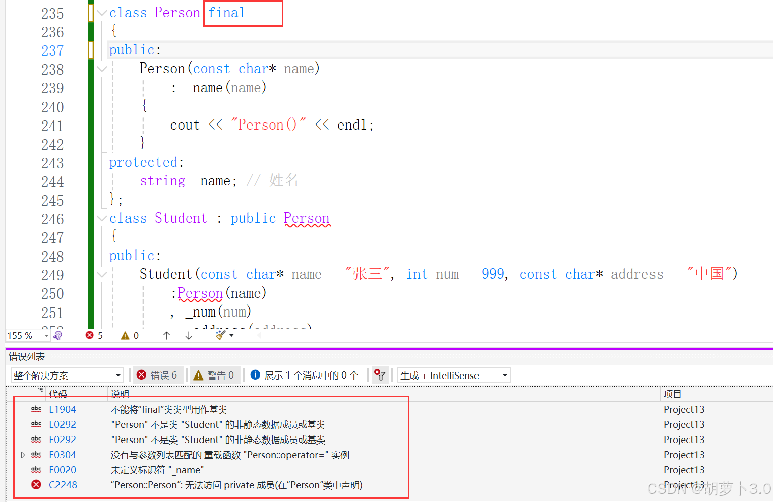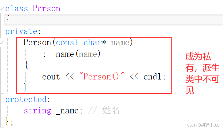 我们知道在继承中先构造父类再构造子类,那如果我们将基类中的构造函数私有化,派生类中就看不见基类中的构造函数,就不能调用基类中的构造函数,那么派生类就无法实例化出相应的对象