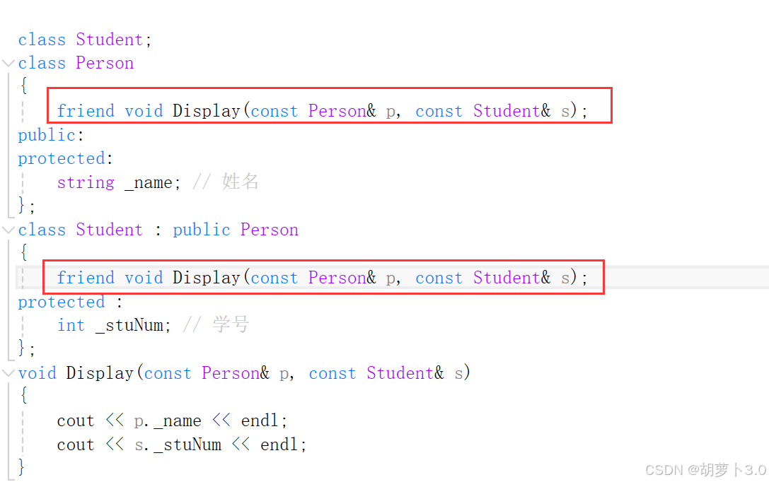 但是我们可以这样写,让Display函数分别成为基类的友元和派生类的友元:
