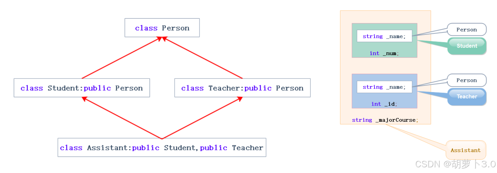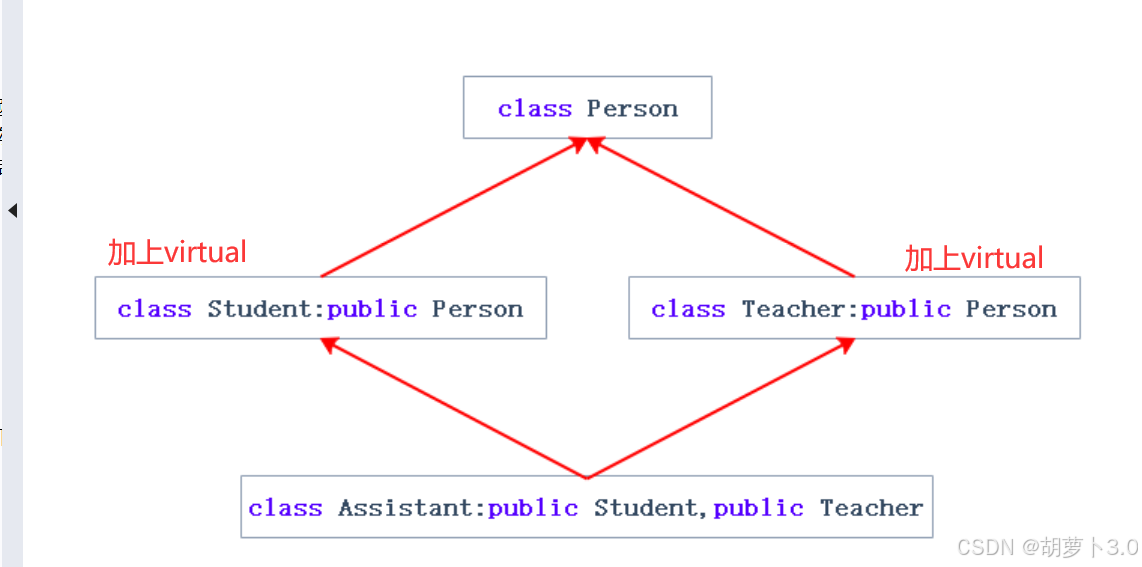 菱形继承的问题,从上面的对象成员模型构造,可以看出菱形继承有数据冗余和二义性的问题,在assistant的对象中person成员会有两份,那就会导致一些问题------