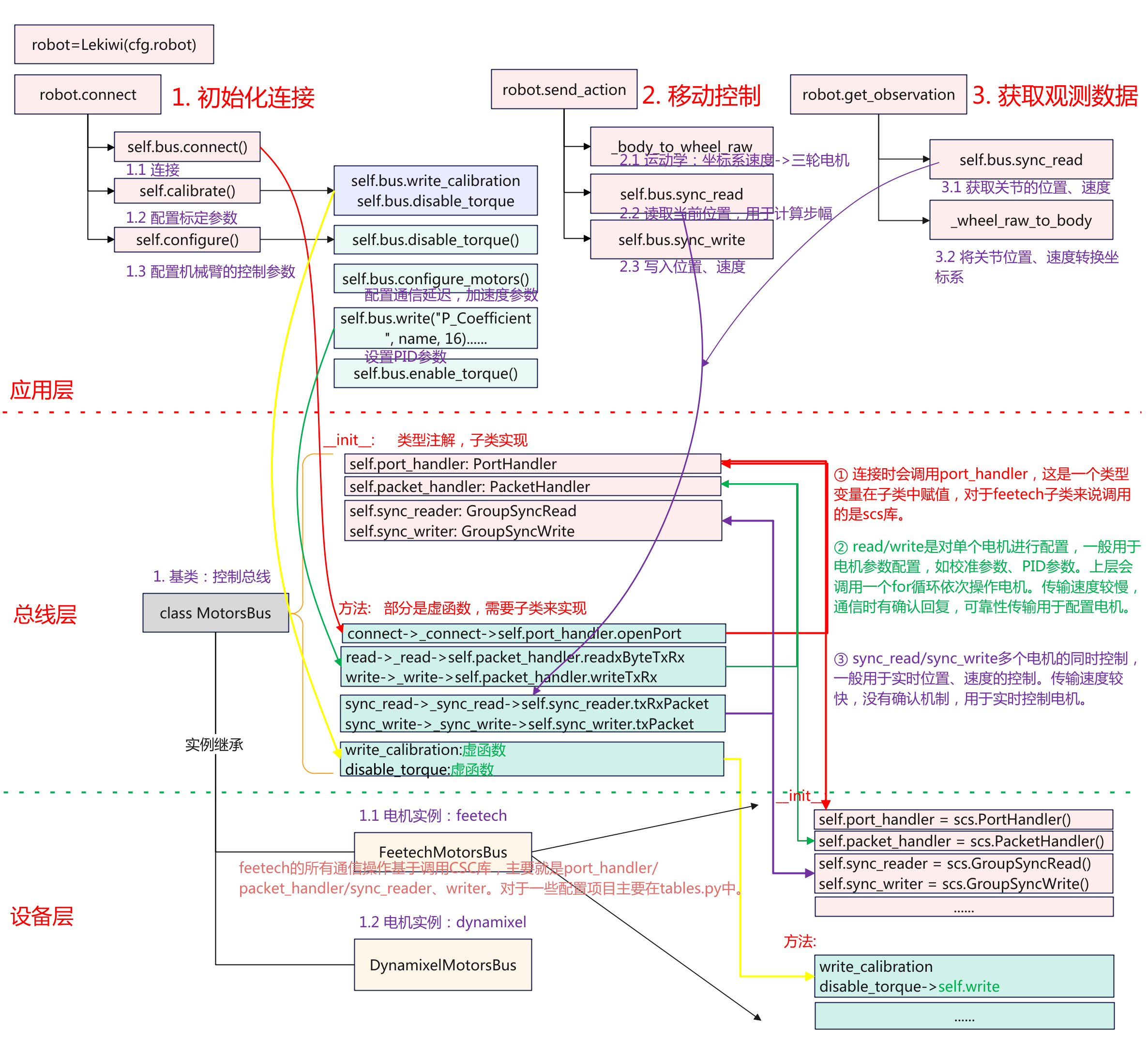 - 设备层:具体设备的实现,继承与MotorBus,实现对电机底层通信接口。