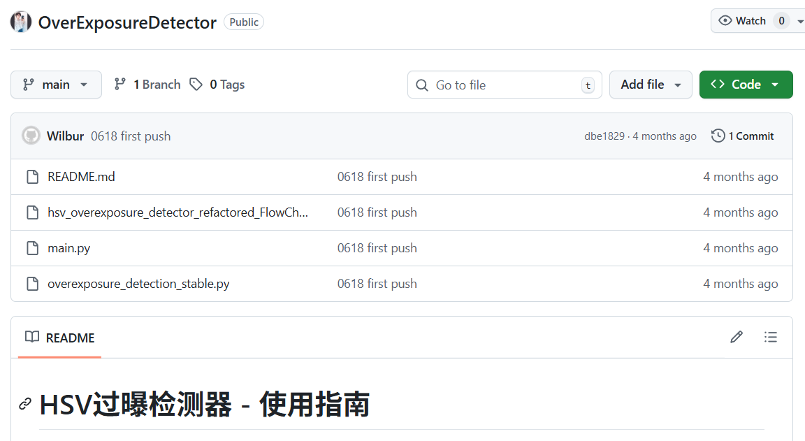 overexposure_detection_stable.py:实现核心检测逻辑,定义HSVOverexposureDetector类,包含初始化参数配置和detect主检测方法。main.py:提供使用示例,演示如何创建检测器、设置参数、处理图像并输出结果。README.md:详细的使用指南,包括快速开始、参数说明、输出说明、最佳实践和常见问题。