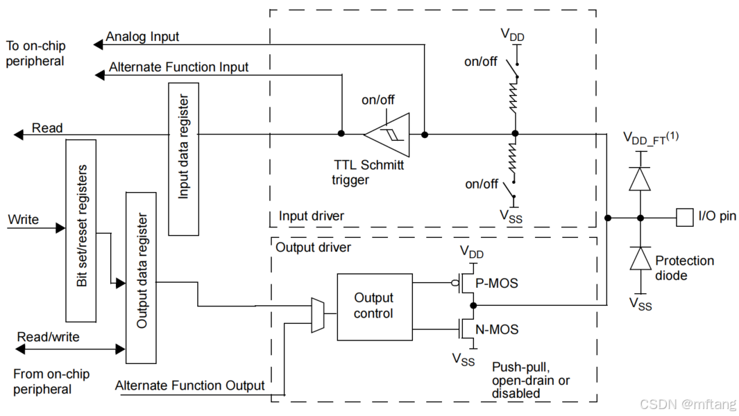 2)当输出设置为1时, NMOS截止,引脚呈现高阻态,此时引脚电平由外部电路(如上拉电阻)决定。