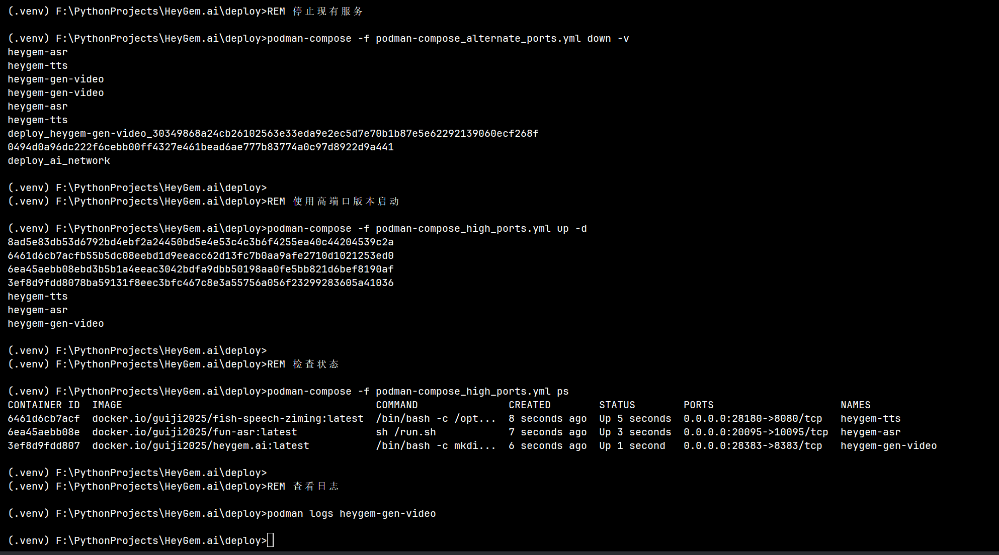 # 进入项目目录(注意:Podman机器中的路径可能不同) cd F:\PythonProjects\HeyGem.ai\deploy # 启动服务 podman-compose -f podman-compose_high_ports.yml up -d