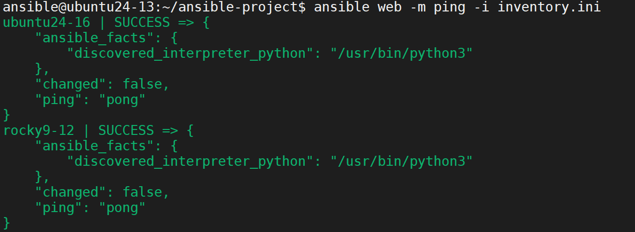 ansible命令直接调用单个模块(如ping、copy)的单行指令(如ansible web -m ping),仅能执行单一任务;Playbook 是基于 YAML 格式的文件,可包含多个任务、变量、条件判断等,是 "任务集合的脚本化定义"。 - 功能复杂度:单个模块命令仅支持简单的单步操作,无法实现流程控制(如循环、条件判断);Playbook 可串联多个任务,支持变量、模板、角色等,能编排复杂的自动化流程如 "安装软件→配置文件→启动服务" 的完整部署。