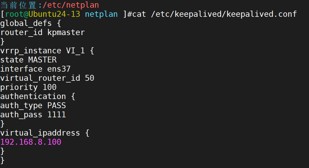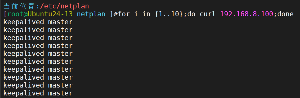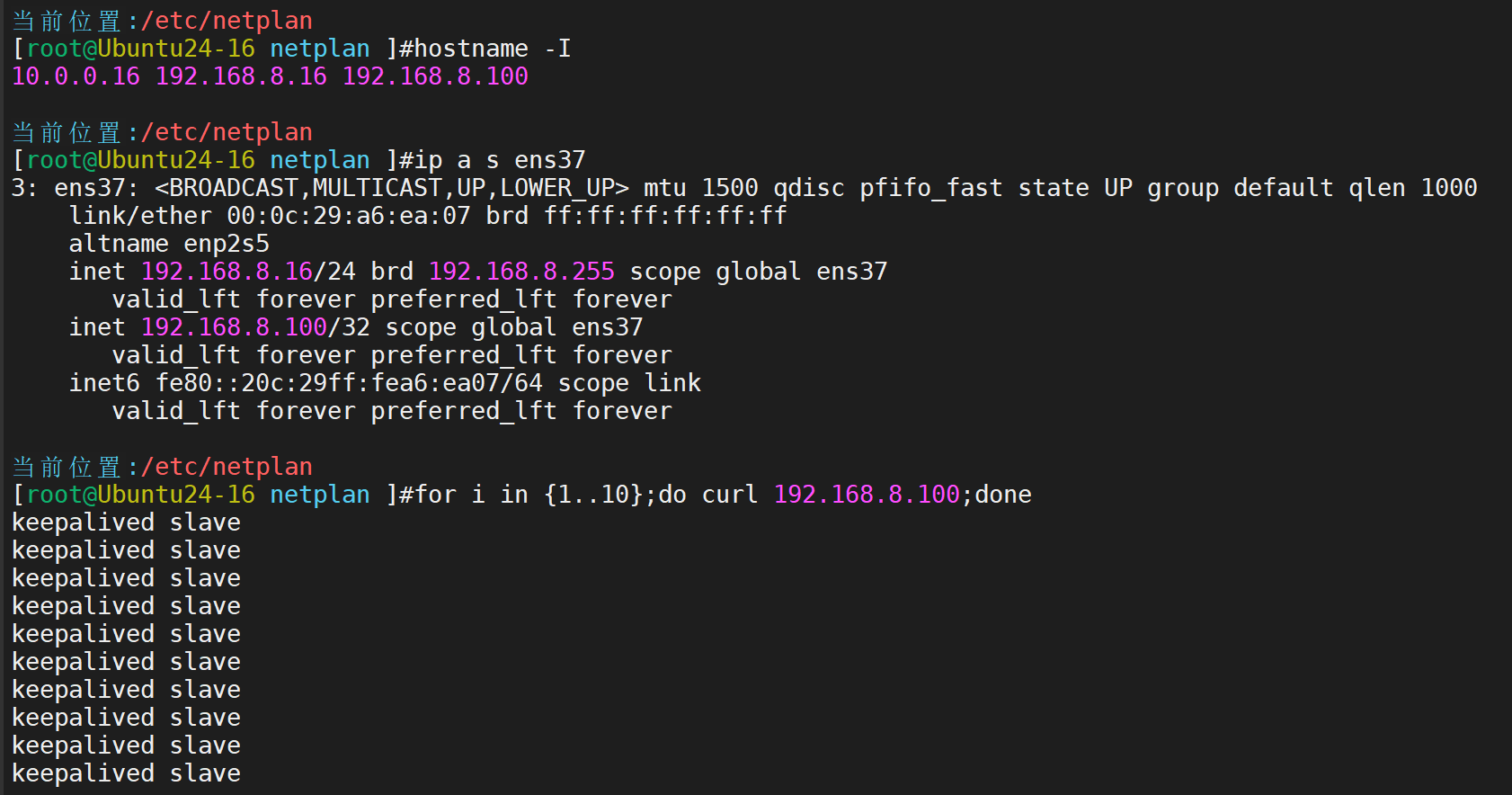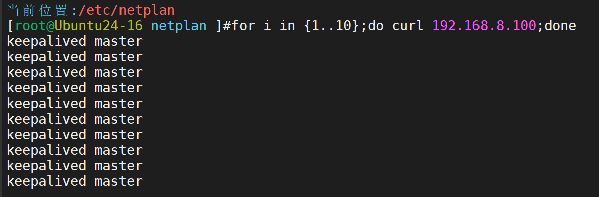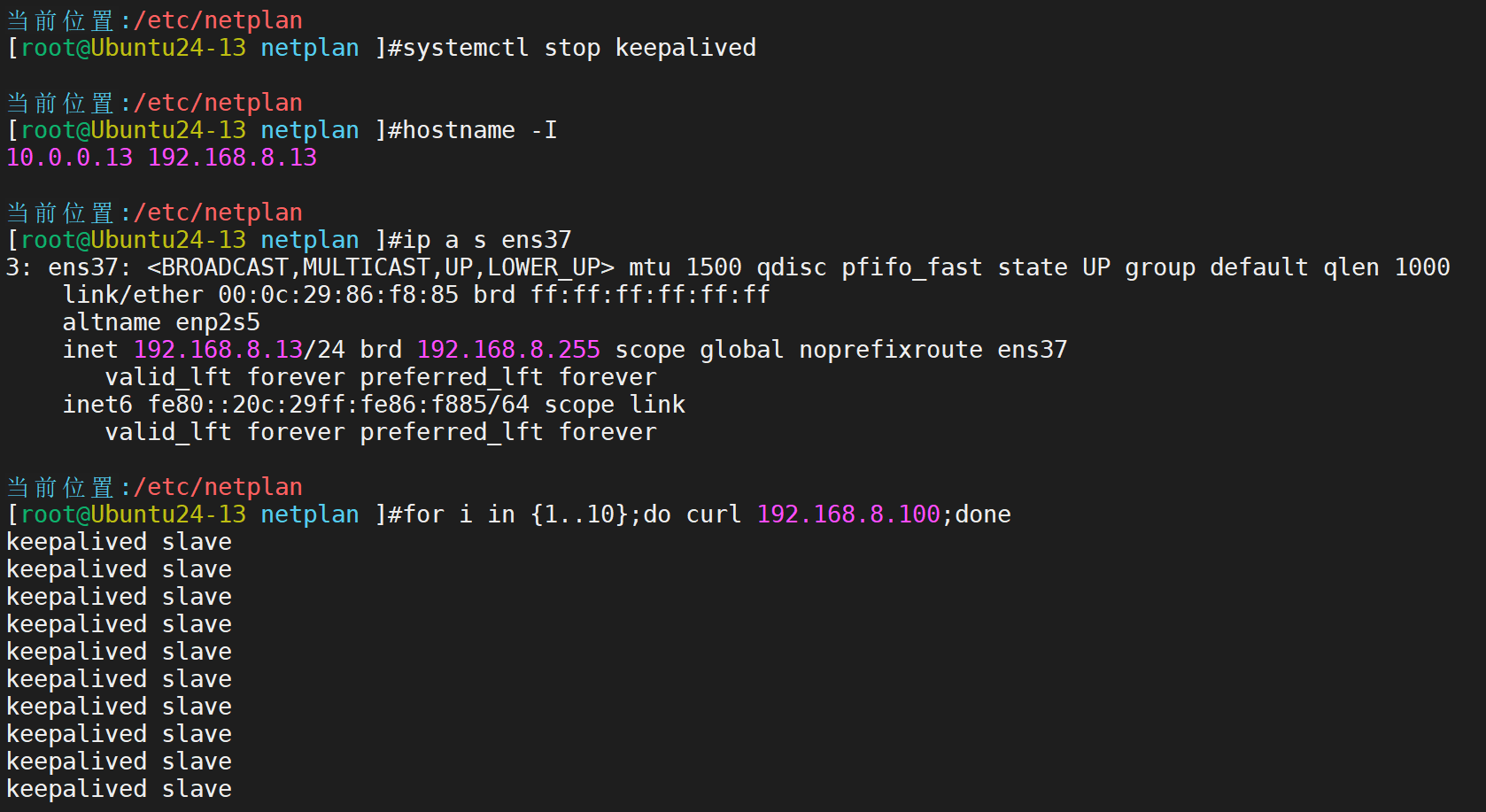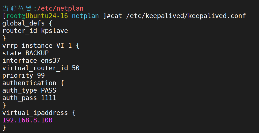 3.在两台 Linux 主机上部署 Keepalived,配置主从节点,实现 VIP 的自动漂移(当主节点宕机时,从节点接管 VIP)。验证状态检测功能:手动停止主节点的 Keepalived 服务,观察从节点是否成功切换并接管服务。