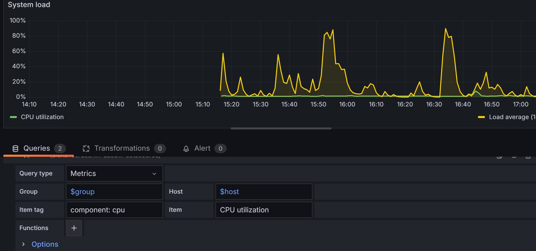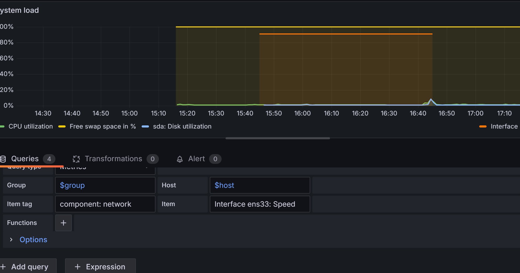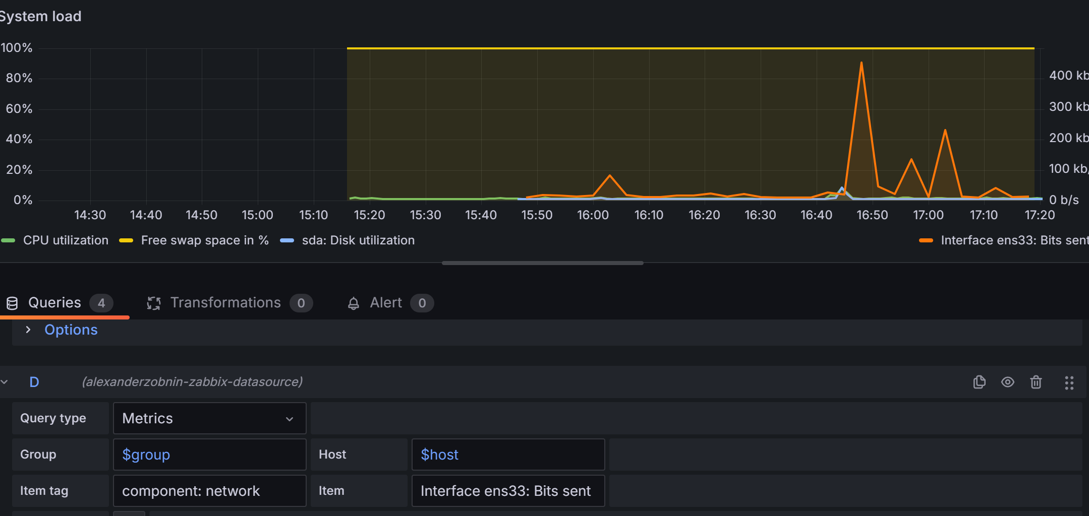 可视化实践:使用 Grafana 连接 Zabbix 数据源,创建 1 个包含 "CPU 使用率""网络流量" 的监控仪表盘。