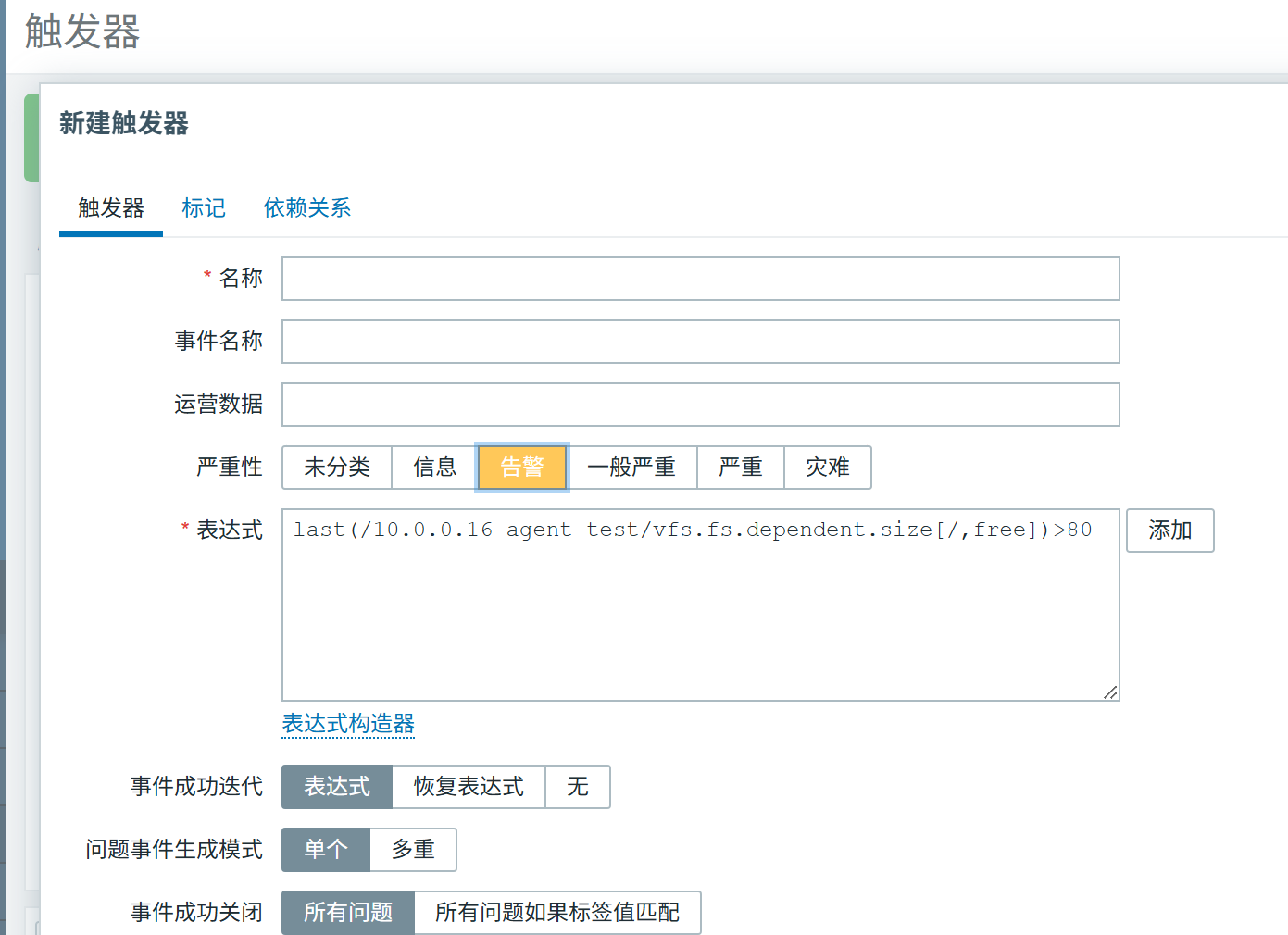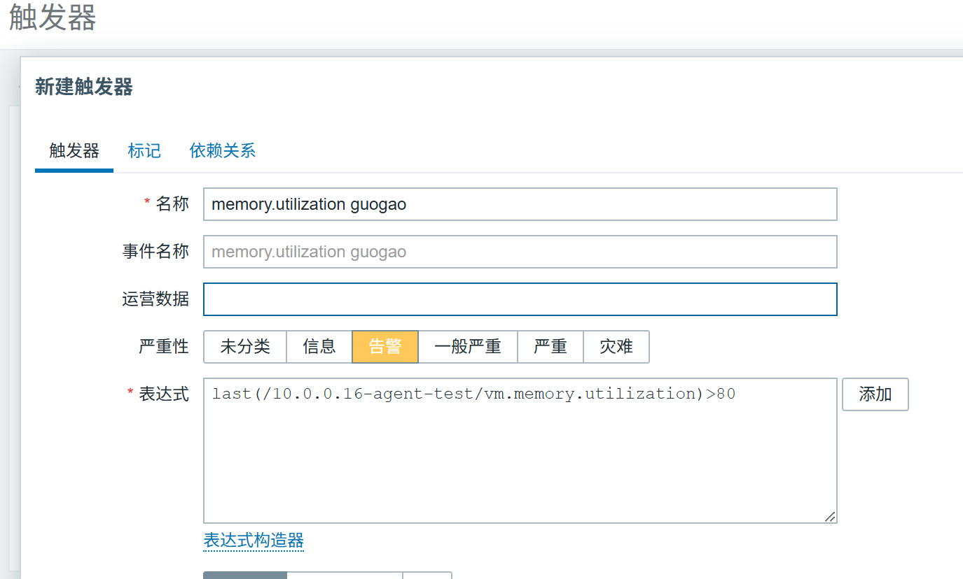 基础监控实践:在 Zabbix 中为 Agent 主机添加 "内存使用率""磁盘空间" 2 个监控项,并配置对应的触发器(如内存使用率 > 80% 触发告警)。