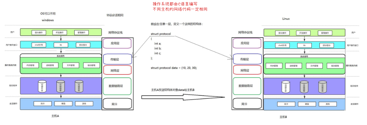 协议,就是约定好的结构体。主机A在传输层有一个结构体,主机B当然也有,并且双方的网络代码是相同的,主机A向B发送这个结构体,主机B可以解析。