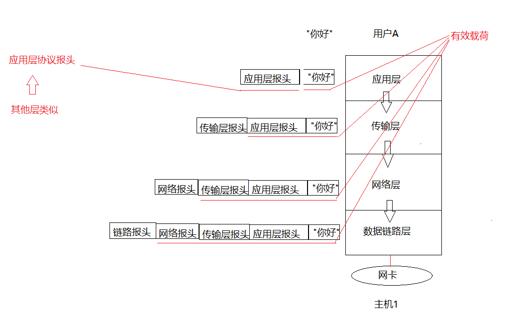 一个报文就分为协议报头+有效载荷。消息只有通过网卡才能发送,所以一个报文会一次一次通过协议栈,加上一个一个的协议报头,最终通过物理层的比特流发送