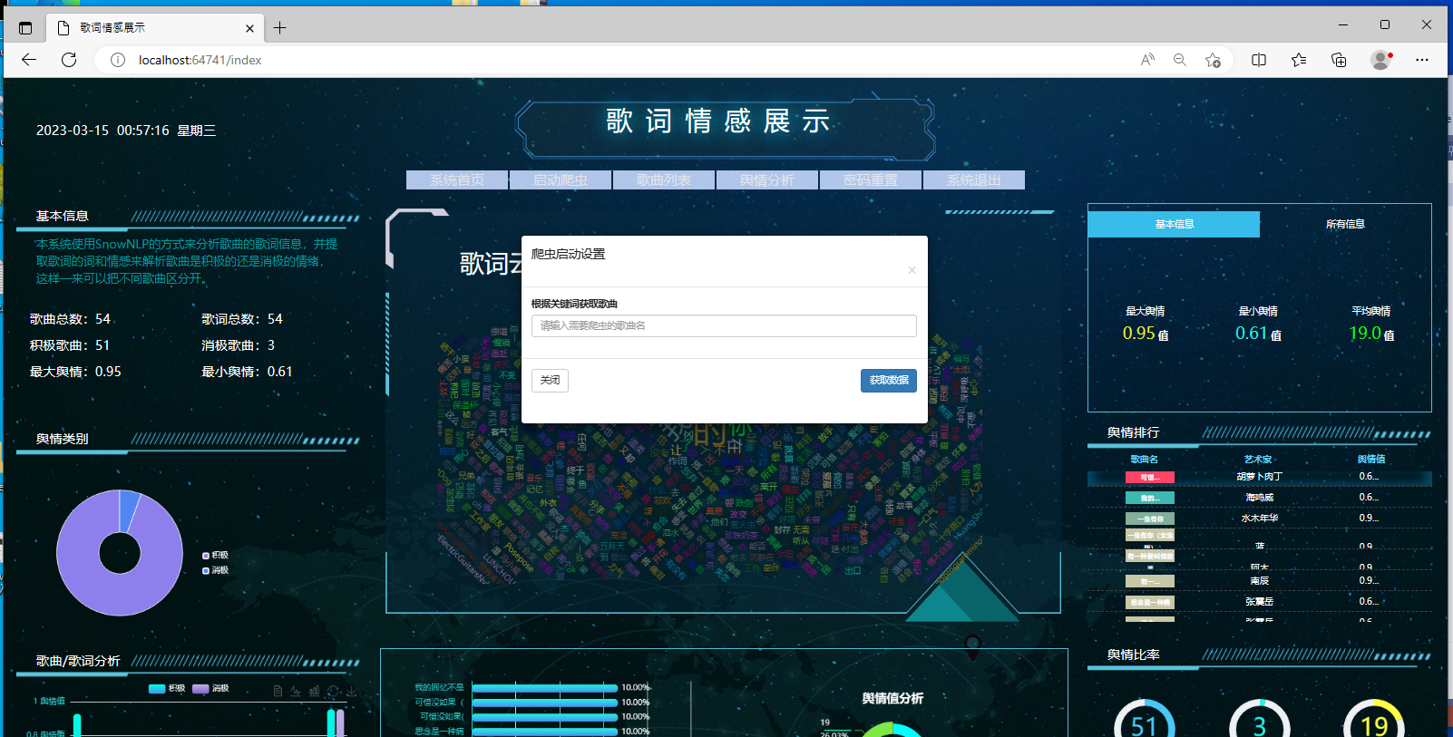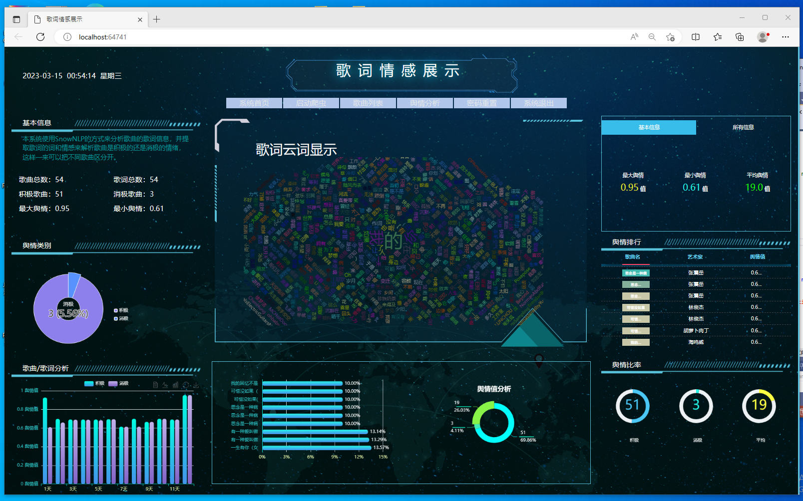 第一次帮助客户做大屏版歌词舆情分析系统Demo,用Python+Flask搭后端,ECharts画大屏图表还挺新鲜的,用NLP分析歌词情感倾向,存到MySQL里,再用ECharts把舆情趋势做成可视化图表,调图表样式花了不少心思。虽然是 demo,但看着大屏上数据实时刷新、情感标签清晰显示,特别有成就感,也摸清了NLP和可视化结合的小技巧。
