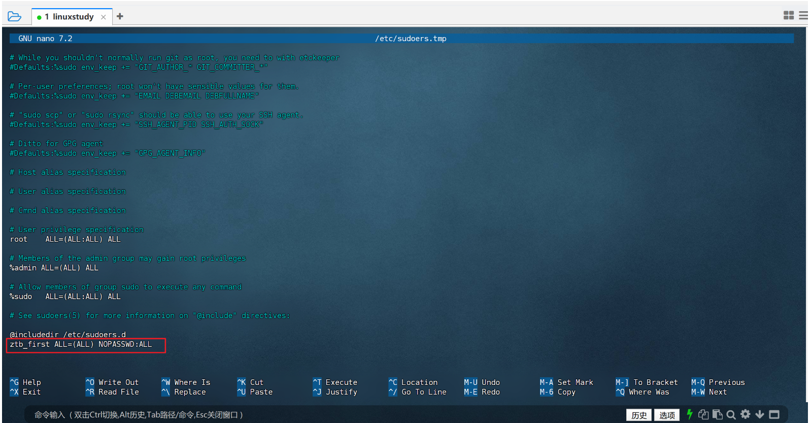 输入visudo,在打开的文件(直接默认打开/etc/sudoers文件,使用的是nano编辑器)直接在最后一行加上:
