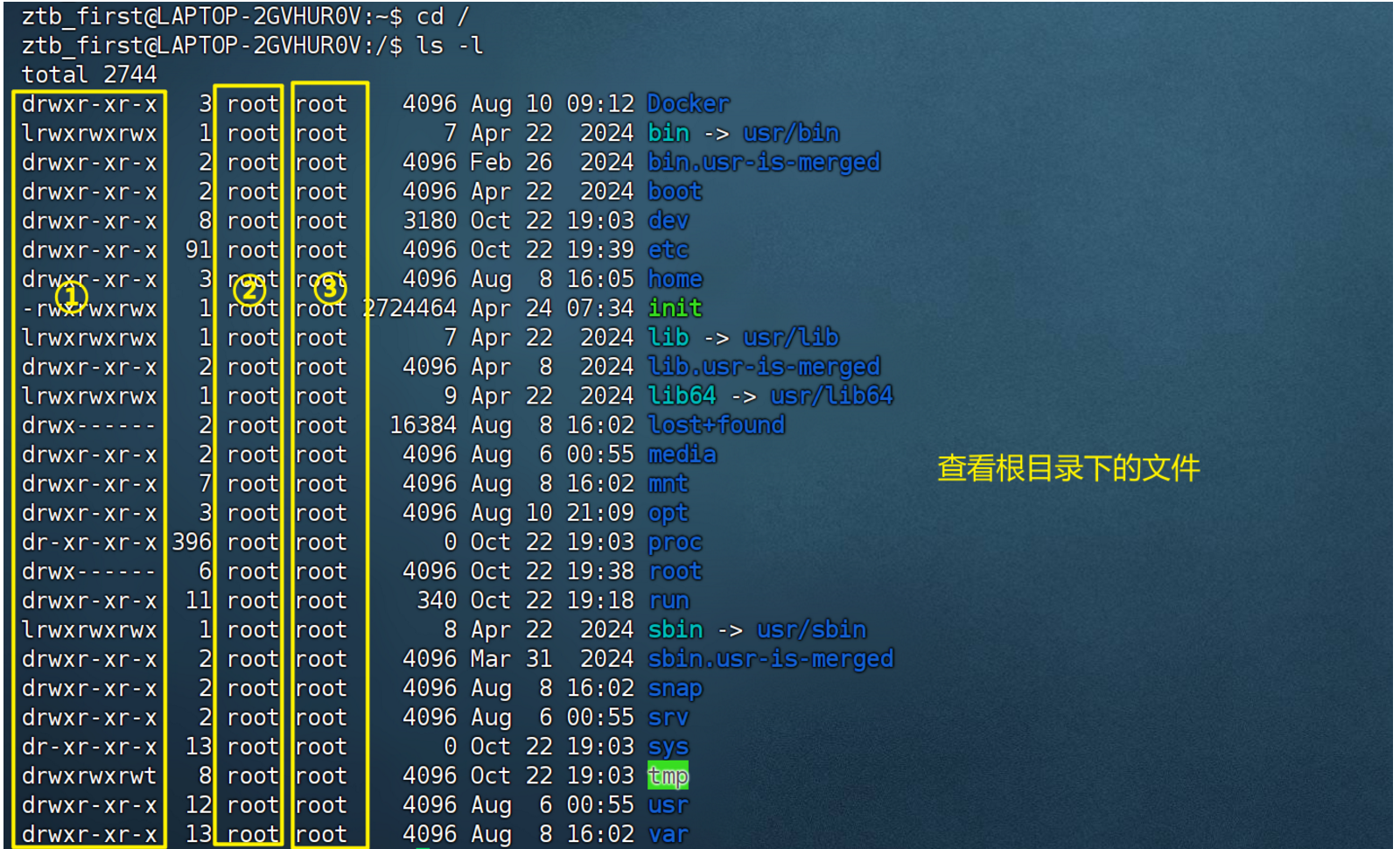 如果以其他用户登录,那么我们所属的用户所拥有的权限由第①行的后三位决定,如根目录下的Docker文件,根据最后三位可见是:r-x,即我们只有读和执行的权限,并没有写权限,无法对其进行修改