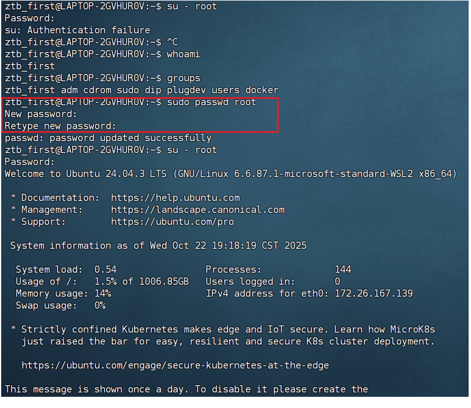 注意:默认情况下,Ubuntu/WSL 的 root 用户可能未设置密码。我们需要为其初始设置密码才可通过使用su切换用户