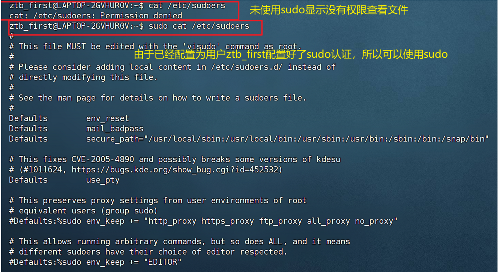 为了避免长时间使用root用户,我们使用sudo为某一条命令临时赋予root用户权限,即在当前用户是sudo认证过后的普通用户的前提下,使用sudo临时获取root用户的权限进行操作。