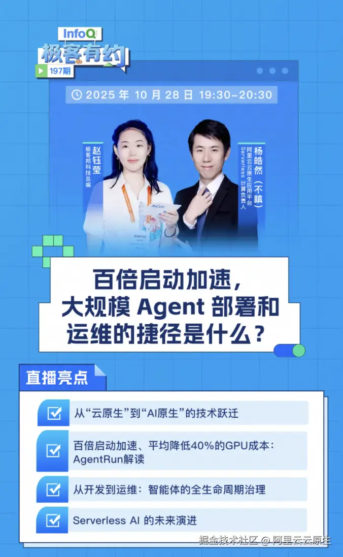随着 AI 原生浪潮的到来,智能体(Agent)正成为企业创新的新引擎。然而,在生产环境中大规模落地 Agent,却面临开发复杂、运维困难、成本高等挑战。那么,这些问题应该如何解决?企业内部大规模部署和运维 Agent 是否有捷径可走?本次直播邀请阿里云 Serverless 计算产品技术负责人不瞋共同探讨上述问题。