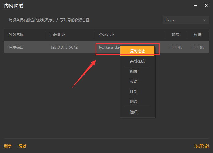 10,创建好后,就可以看到一条映射的公网地址,鼠标右键点击【复制地址】。