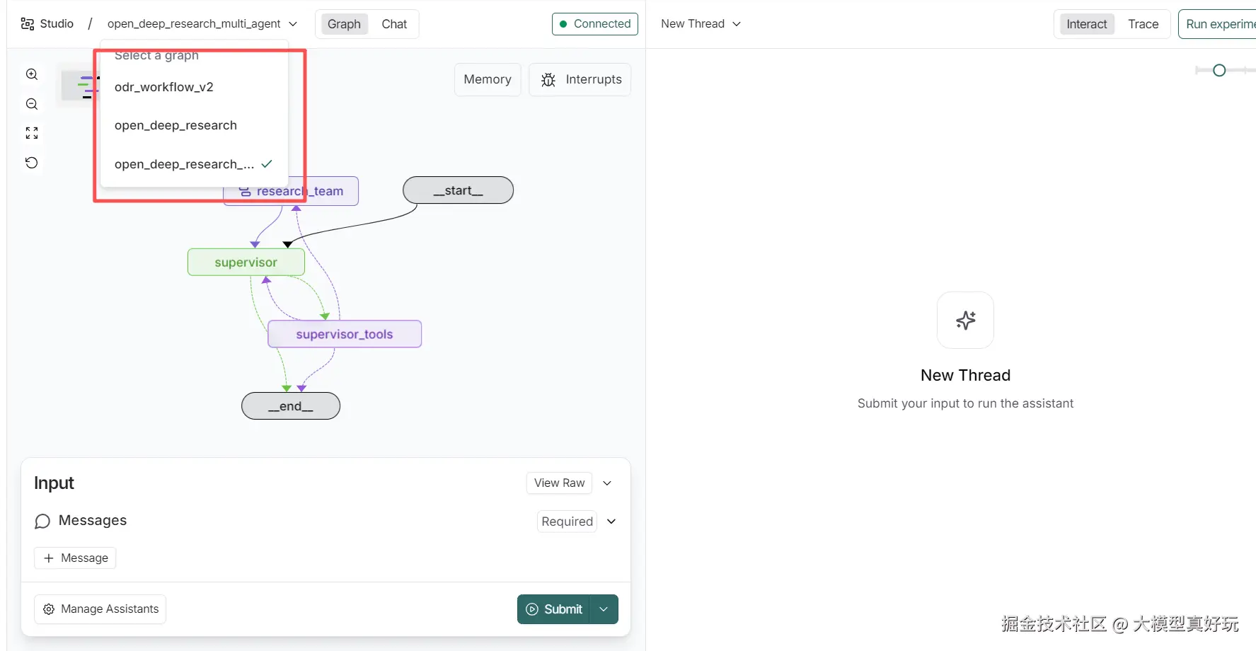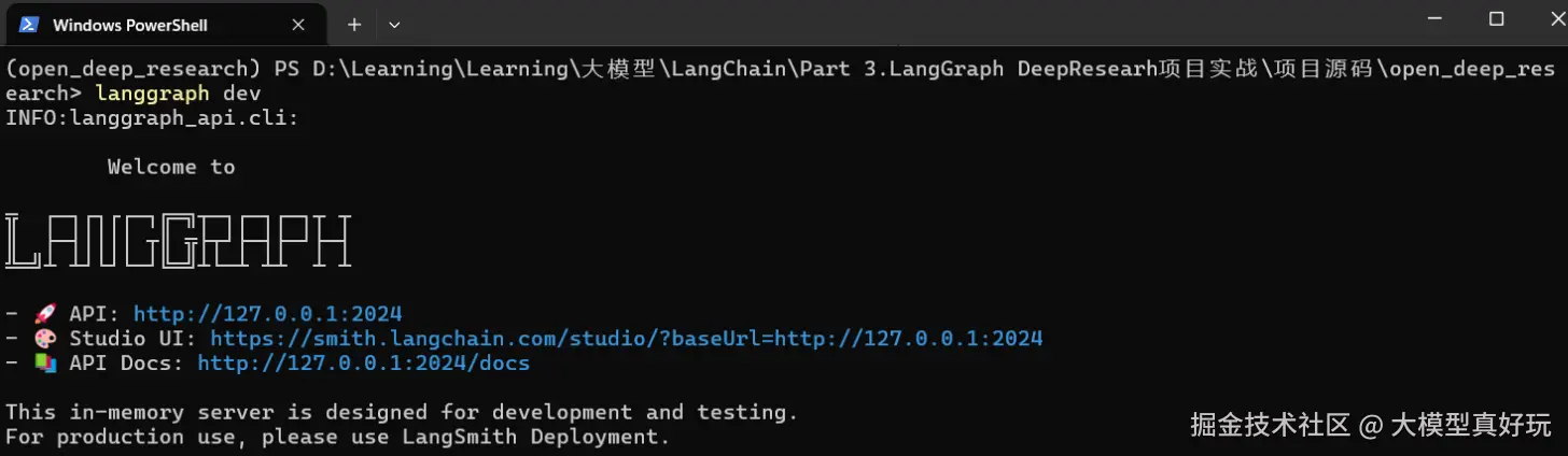 langgraph dev在本地开启服务,点击命令行中的Studio UI链接即可进入深度研究助手界面。