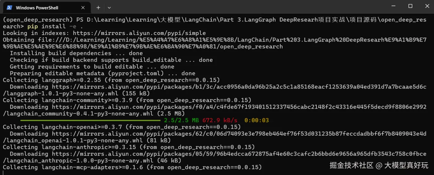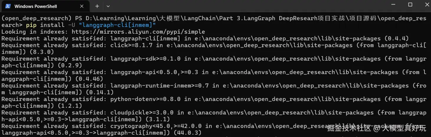 open_deep_researcher项目最好先创建一个anaconda虚拟环境并激活,然后安装open_deep_researcher项目依赖, 执行的命令如下: