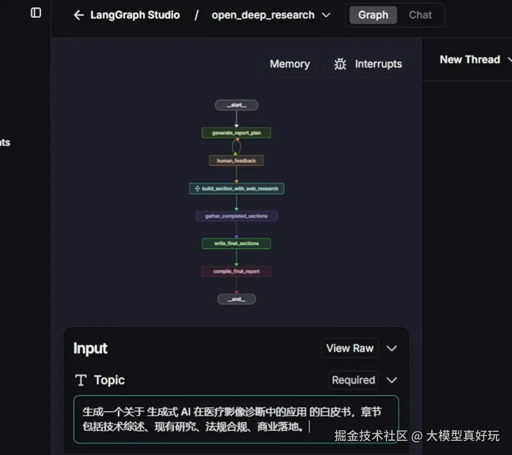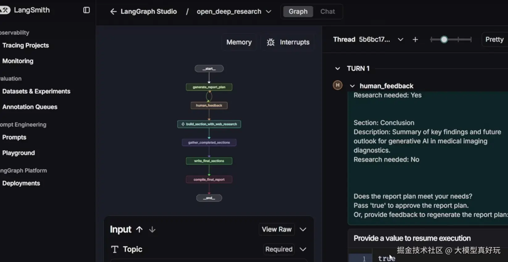 在LangGraph Studio UI界面中,用户可以输入研究主题或问题,实时观察代理的自动检索和报告生成过程,还可以通过配置面板调整运行参数,在遇到人工操作确认可以使用JSON输入框进行流程控制(确认计划或提供修改意见),大家可以在本地部署并尝试使用不同模式完成DeepResearch专题报告的生成。