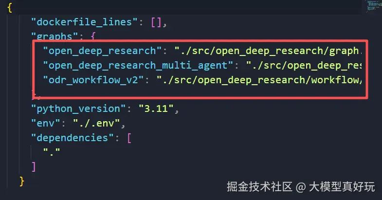 我们查看项目文件夹下的langgraph.json配置文件,可以看到系统启动时会加载三个不同的图工作流:
