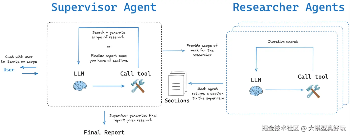 Multi-Agent模式完全基于工具调用模式设计,使代理行为高度可控且可预测。采用模块化设计,明确划分监督者与研究者的职责边界,这使得该系统可以支持多个章节同时由不同的研究代理独立处理,最大化利用计算资源。
