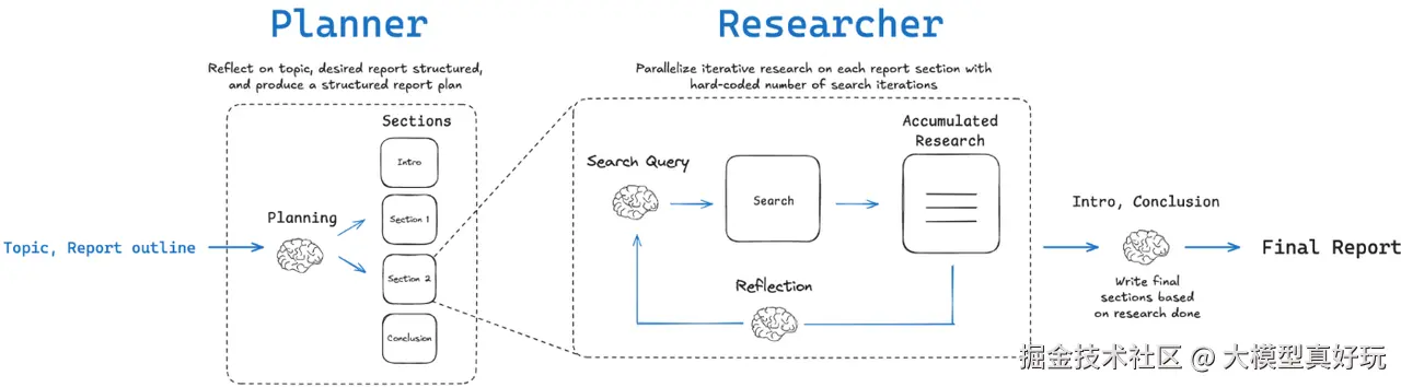 这一架构将简单的线性流程升级为具备反馈循环和并行处理能力的智能工作流,显著提升了研究报告的深度与准确性。