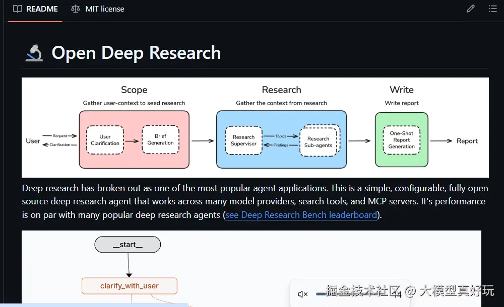 OpenDeepResearch基于LangGraph框架开发,具备优秀的模块化设计和部署便捷性。该项目通过LangGraph实现了复杂代理流程的标准化,为开发者提供了深度研究Agent定制和扩展的高效基础。安装部署open_deep_research十分简便,笔者这里推荐大家使用源码安装。大家可关注笔者的同名微信公众号:大模型真好玩 ,并私信opendeepresearch便可获得项目源码。