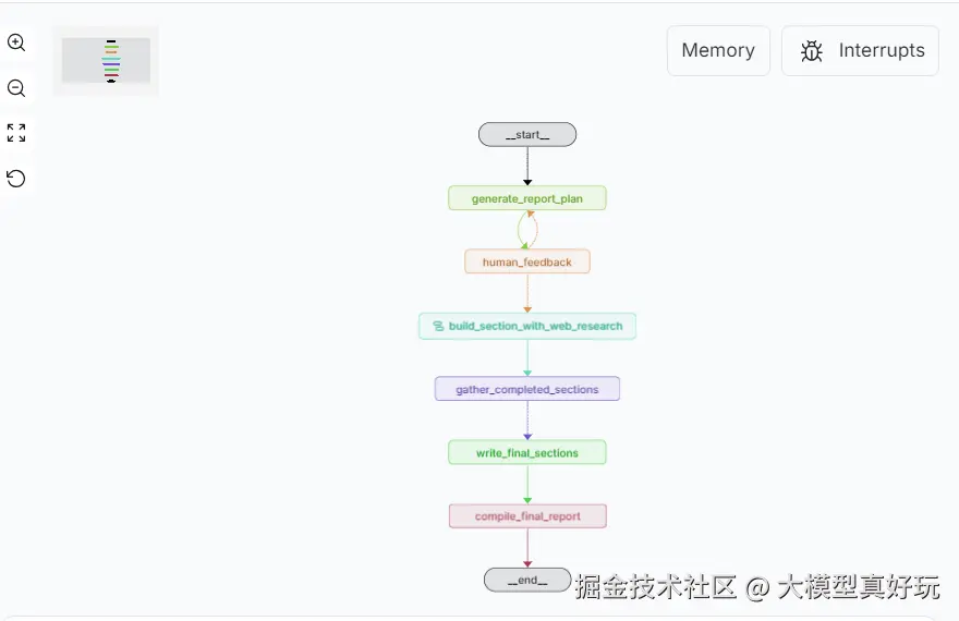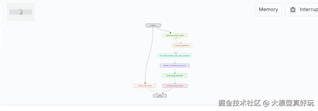 - 交互式节点(用到interrupt, 该功能笔者LangGraph教程中并未提及,大家正好借此机会进行学习),获取用户对报告计划的反馈