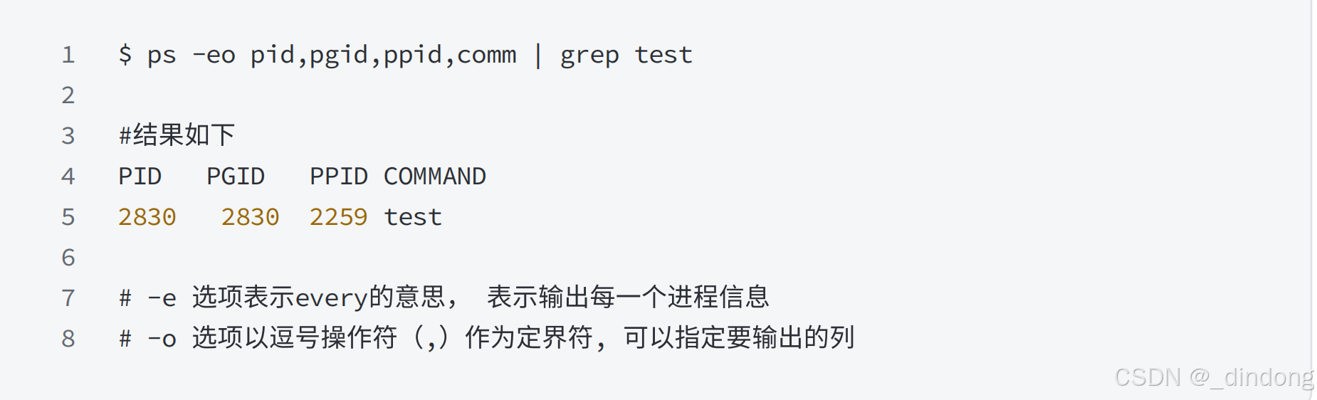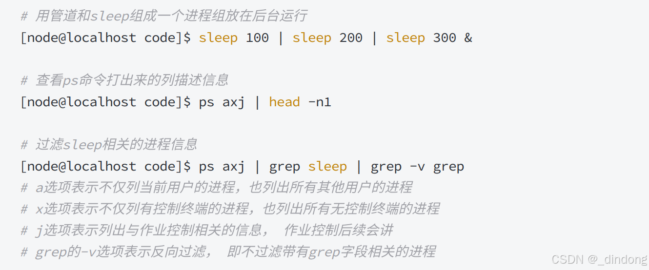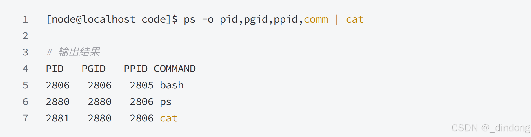 从结果上看ps进程的PID和PGID相同, 那也就是说明ps进程是该进程组的组⻓进程, 该进程组包括ps和cat两个进程。