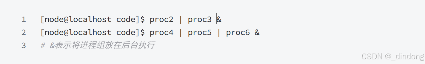 通常我们都是使⽤管道将⼏个进程编成⼀个进程组。 如上图的进程组2和进程组3可能是由下列命令形成的: