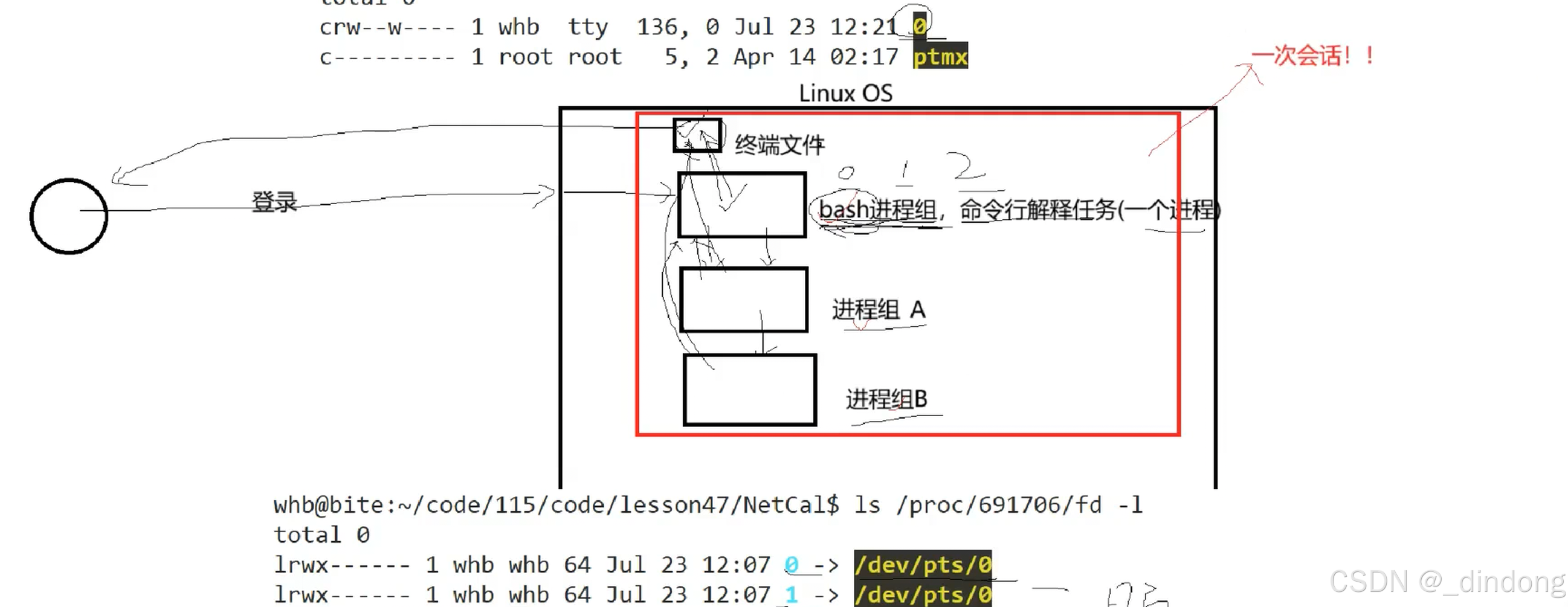 在UNIX系统中,**⽤⼾通过终端登录系统后得到⼀个Shell进程,这个终端成为Shell进程的控制终端。控制终端是保存在PCB中的信息,我们知道fork进程会复制PCB中的信息,因此由Shell进程启动的其****它进程的控制终端也是这个终端。**默认情况下没有重定向,每个进程的标准输⼊、标准输出和标准错误都指向控制终端,进程从标准输⼊读也就是读⽤⼾的键盘输⼊,进程往标准输出或标准错误输出写也就是输出到显⽰器上。另外会话、进程组以及控制终端还有⼀些其他的关系,我们在下边详细介绍⼀下: