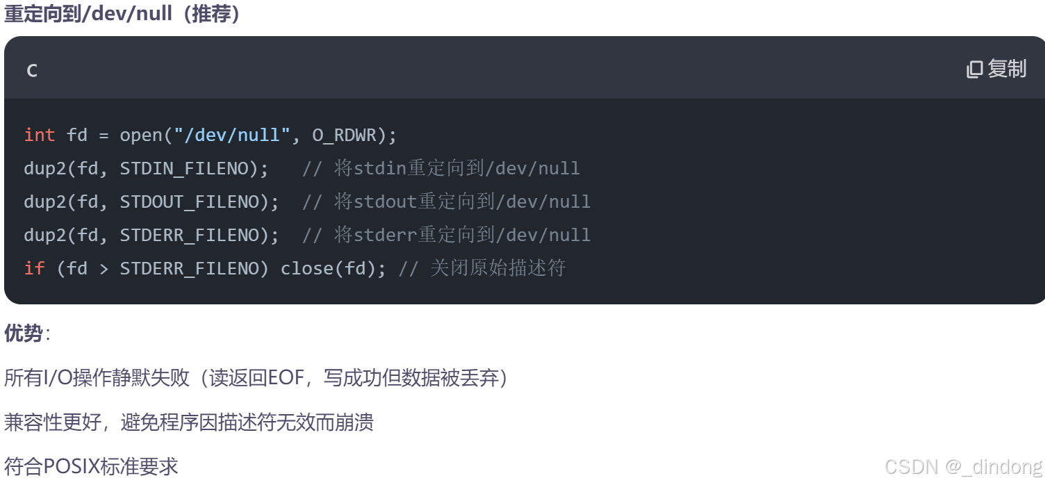 **此外,**守护进程因为脱离终端,标准输入/输出/错误(0/1/2)失去实际意义,若不处理会导致: