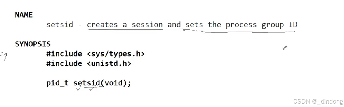首先要想成为守护进程,进程得先从原本的会话独立出来,成为一个独立会话,为此我们需要setsid函数