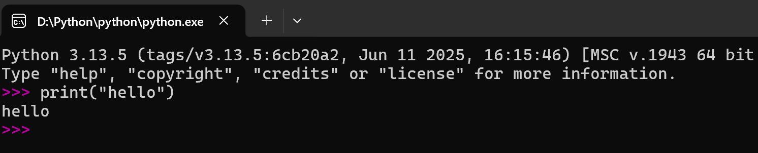 直接输入 print('hello') 这句代码, 按下 enter 键, 则打印出了 hello 这样的结果.