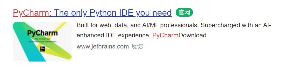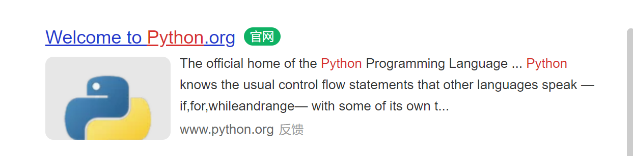 在搜索引擎中搜索 python 关键字, 带有 "官网" logo 的结果即为 Python 官方网站(注意不要点到带有"广告字样" 的结果).