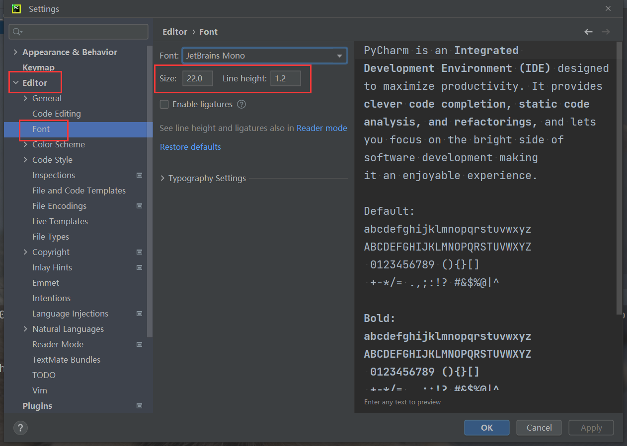 找到 Editor -> Font, 把字体 Size 和 Line height 都适当调整.