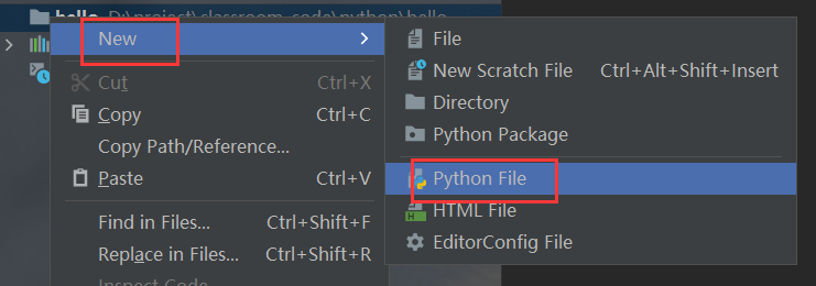 右键左侧的项目目录, 选择 New -> Python File,填写文件名