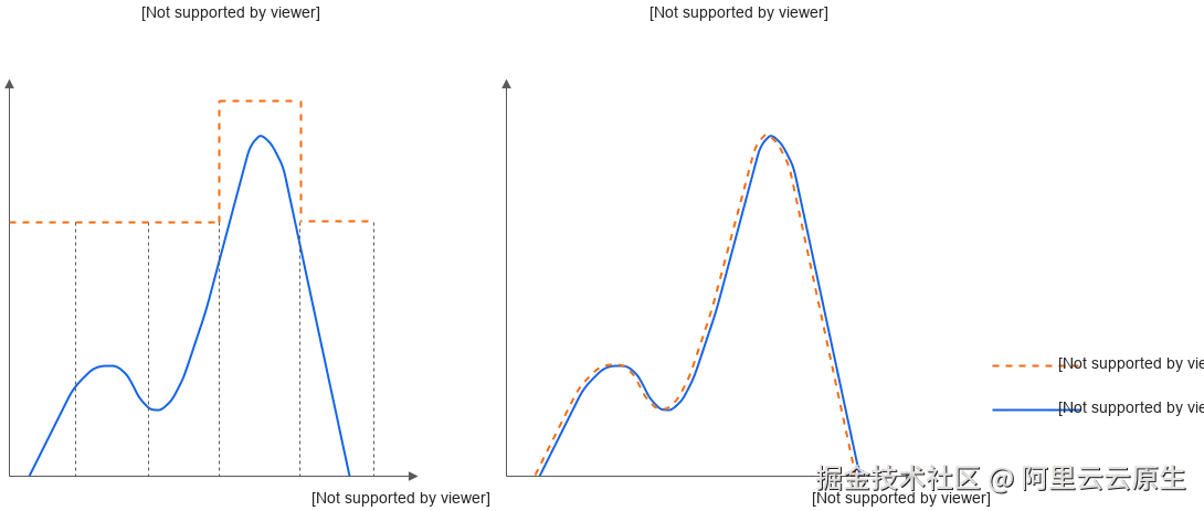在业务波动较大的场景下,非 Serverless 实例(包年包月和按量付费)与 Serverless 实例在使用规格上存在明显差异,具体变化情况如下图所示: