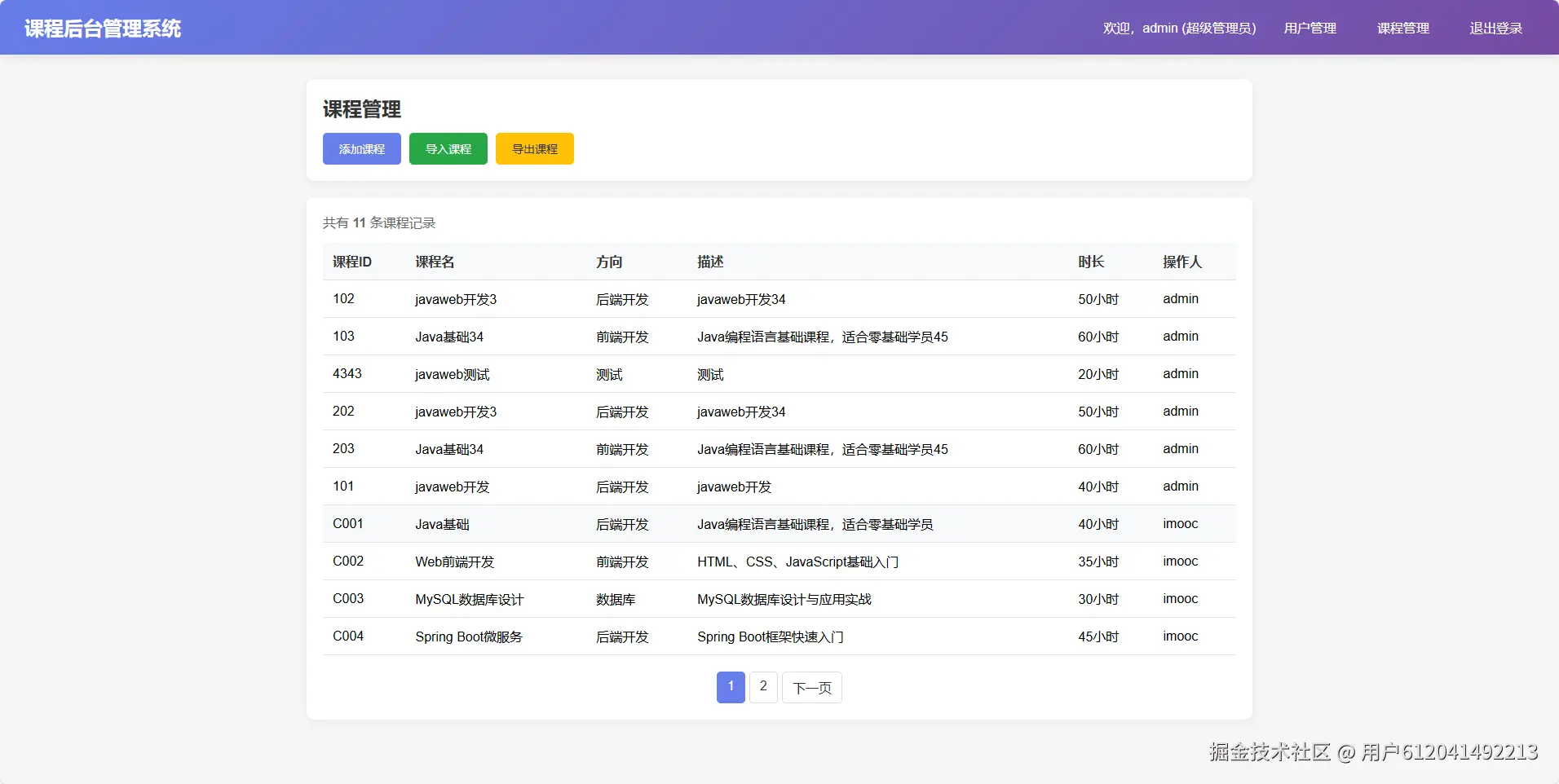 查看课程:在列表中查看所有课程,支持分页