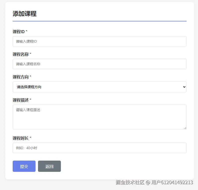 添加课程:点击"添加课程"按钮,填写表单