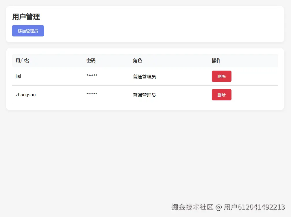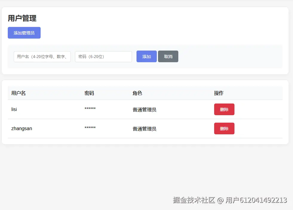 删除管理员:点击用户列表中的"删除"按钮
