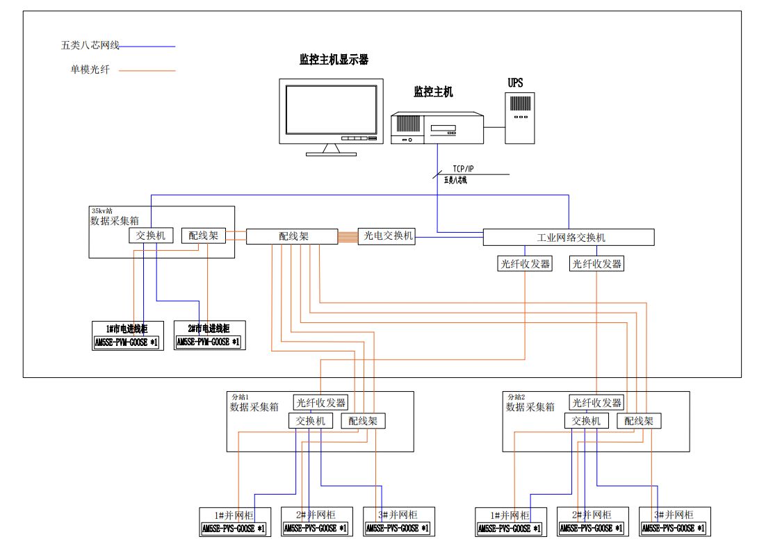 GOOSE 通讯方案:选用主机AM5SE-PVM-GOOSE与从机AM5SE-PVS-GOOSE组合,通过光纤组通信网络,100m - 20km 主从机之间采用 1310nm 单模光纤(FC 接口),20km-40km主从机之间采用 1550nm 光纤,只需按防逆流监测点配置主机AM5SE-PVM-GOOSE数量,1个防逆流监测点1台A主机M5SE-PVM-GOOSE,1个从机AM5SE-PVS-GOOSE最多可以跳10个跳闸点(每个跳闸点离装置距离不超过50米),1台AM5SE-PVS-GOOSE可以做8段低功率跳闸;